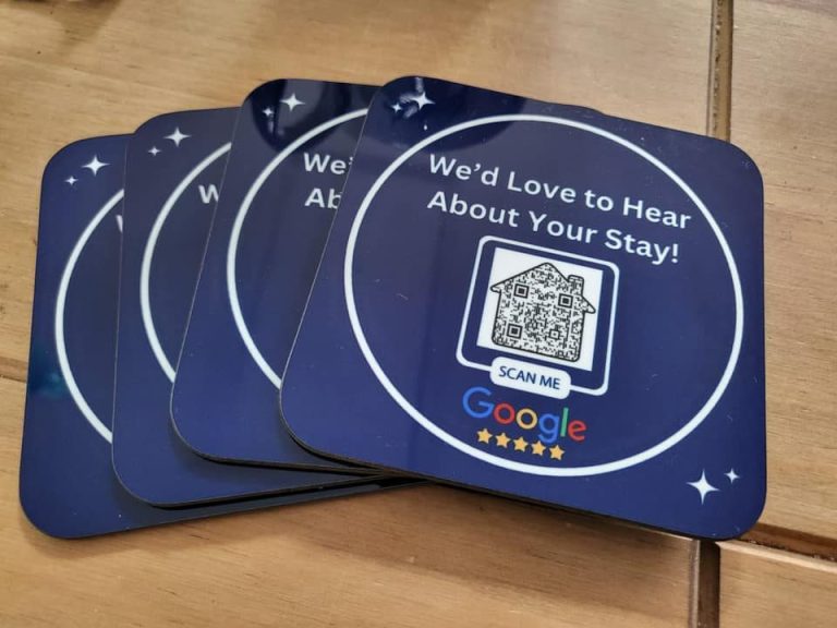 - Personalised coasters encouraging guests to leave Google reviews and support the cottage’s online reputation